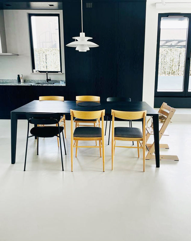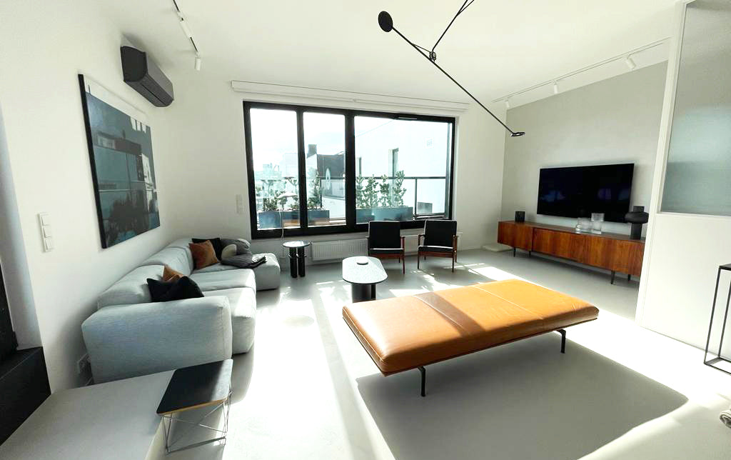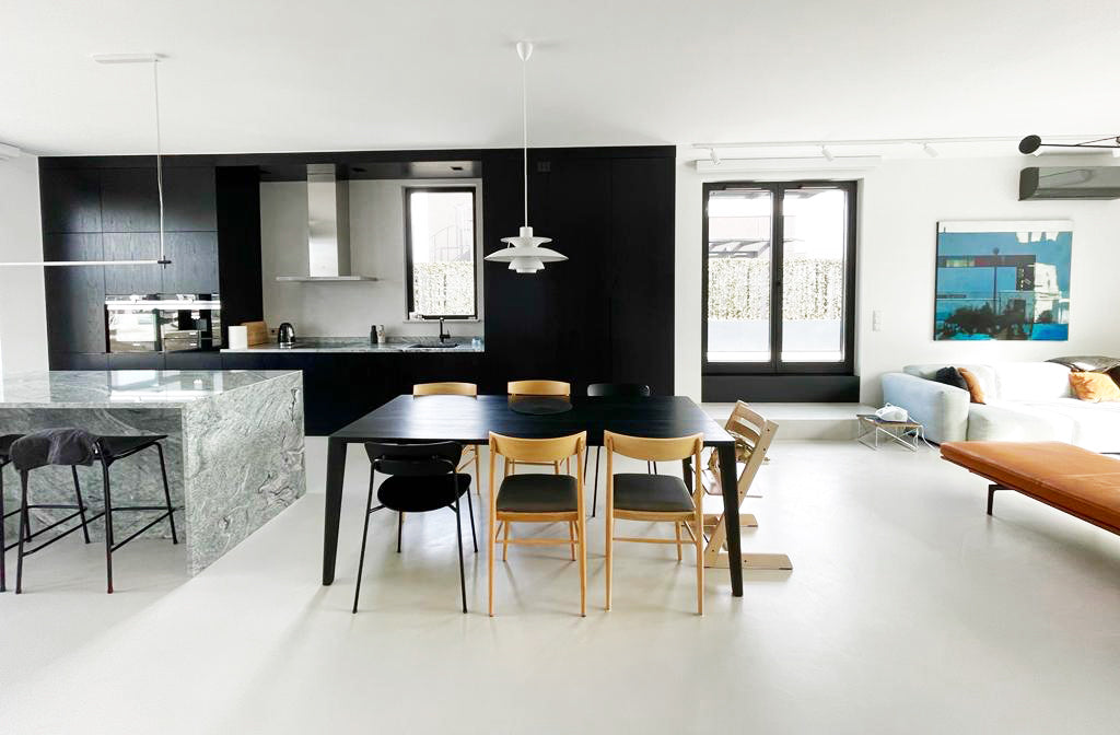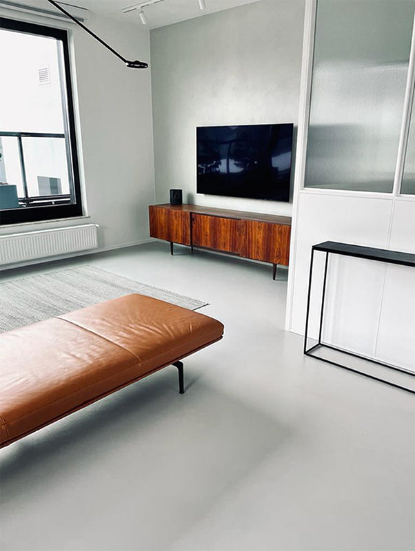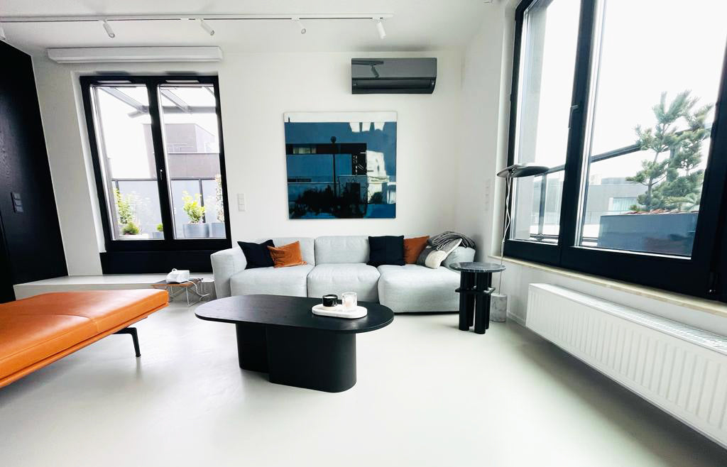 In the living room with light microcement flooring, besides the gray sofa with black and brown pillows, the attention is drawn to Agnieszka Wielewska’s painting “February” hanging above it. This contemporary accent fits perfectly into the context of modern brutalism, while introducing a touch of abstraction and depth.