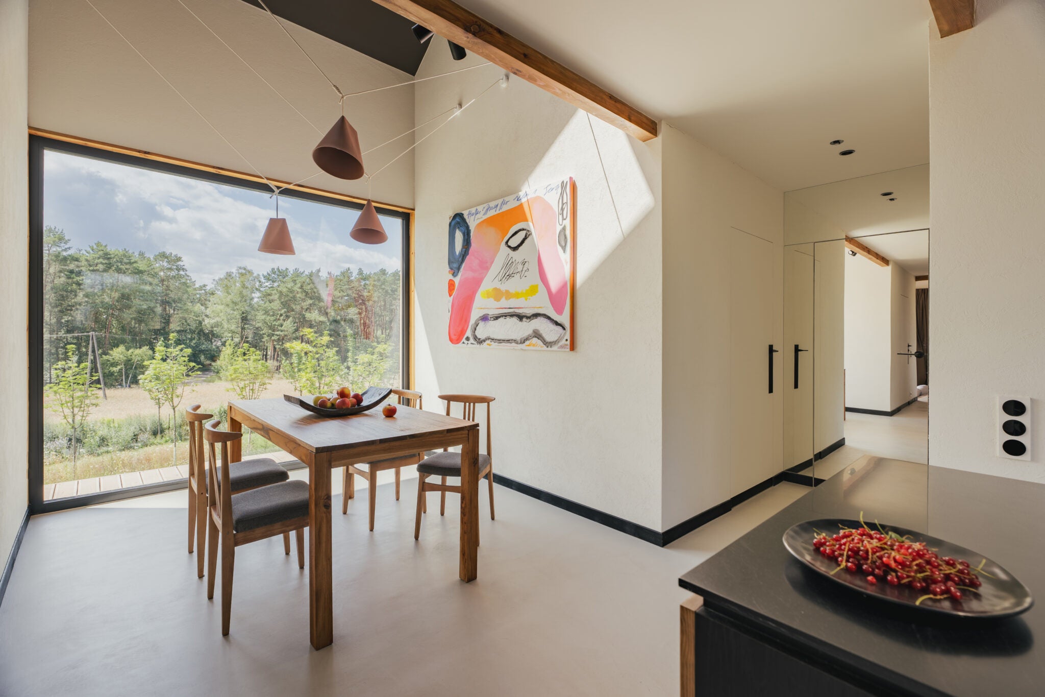 Additionally, the ‘House with a Footbridge’ becomes a gallery where art and craft find their irreplaceable place. Abstract canvases and handmade works of art create a dialogue with the raw beauty of the microcement surfaces, proving that a balance between functionality and aesthetics can be found in the world of design. It is here, amidst the serenity of the Mazovian landscapes, that art merges with the everyday, creating a space that is as inspiring as it is comfortable.