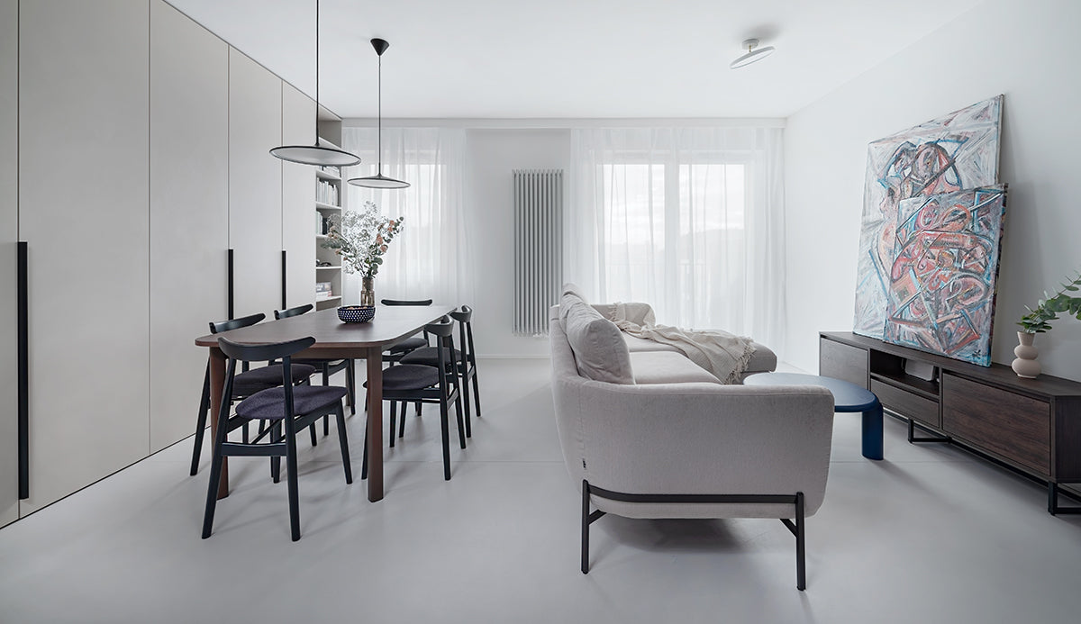 The entire arrangement is proof of how microcement can provide the basis for a variety of textures and colors, creating an interior that is not only aesthetically consistent, but also tailored to the needs of its occupants. The microcement on the floor of this apartment is also a practical element, easy to maintain and resistant to everyday challenges. This realization shows that intelligent design can bring beauty out of simplicity, creating a place that is both stylish and functional for daily use.