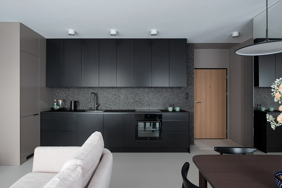 Microcement on the kitchen floor is a perfect example of how modern materials can combine aesthetics with interior functionality. Microcement’s durability and ease of cleaning make it an ideal surface for everyday use in this heavily used area of the interior. The kitchen looks stylish with dark cabinets and countertop, which harmonize with the kitchen apron and microcement on the floor. High-quality household appliances are perfectly integrated, providing functionality and comfort.