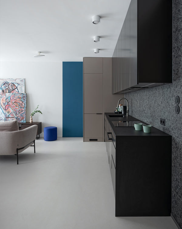 In this arrangement, the microcement floor seamlessly blends the various interiors to create a harmonious space. The delicate FL03 July Beige color that covers the floor illuminates each room, providing a neutral backdrop for the carefully selected furnishings. The living area, comprising the living room, kitchen and dining room, acts as the heart of the apartment. A soft sofa in pastel tones invites relaxation, while its muted color creates a calm atmosphere. The minimalist lines of the furniture are complemented by careful details and soft lighting, which together create a balanced aesthetic composition.