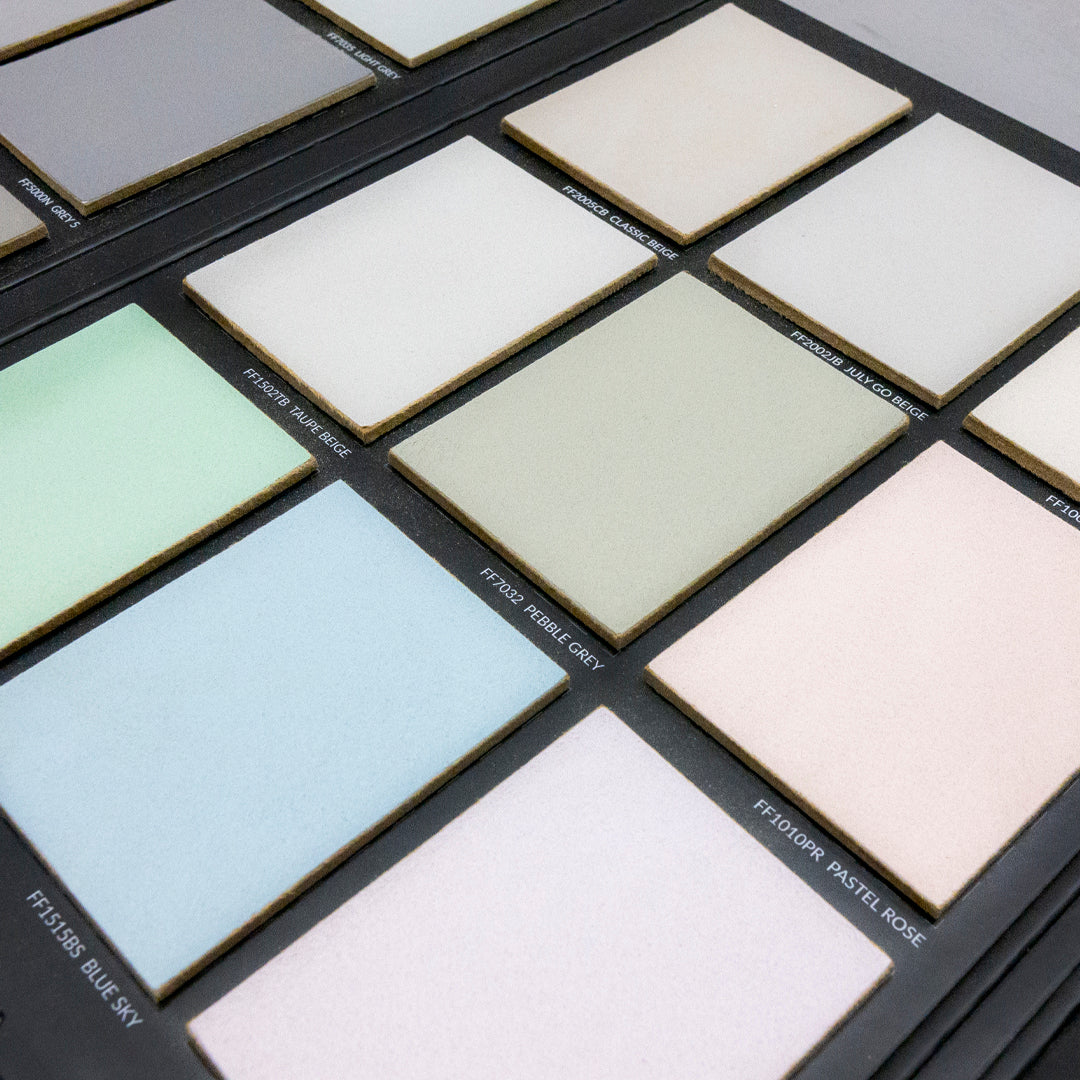 Each microcement sample is carefully finished with a matte varnish that ensures durability.