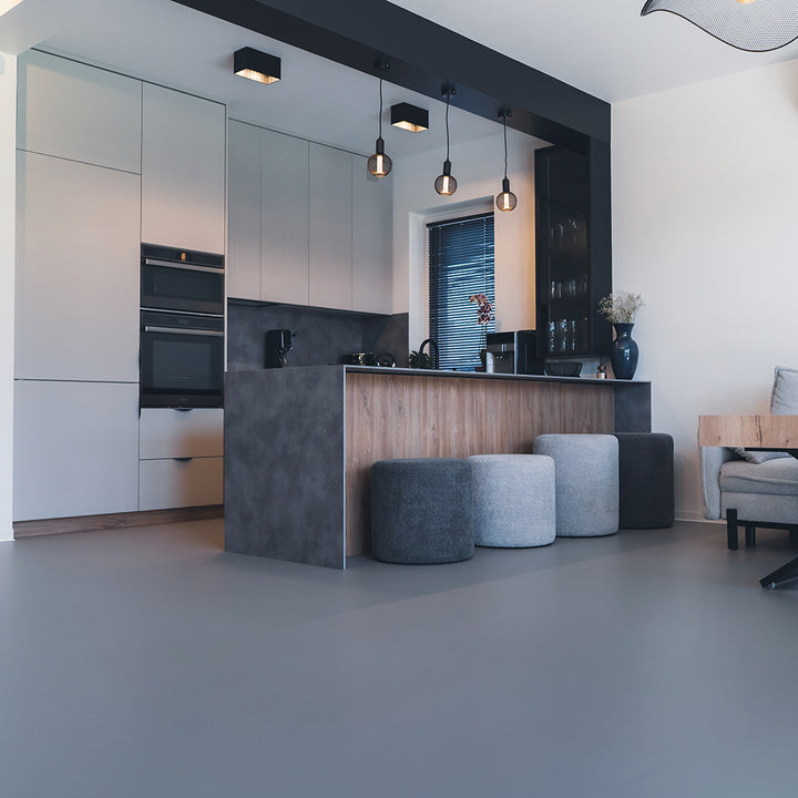 Le kit comprend l'ensemble des matériaux nécessaires à la réalisation d'un sol en microciment de 10 m² : primaire, microciment et vernis d'imprégnation pour microciment.