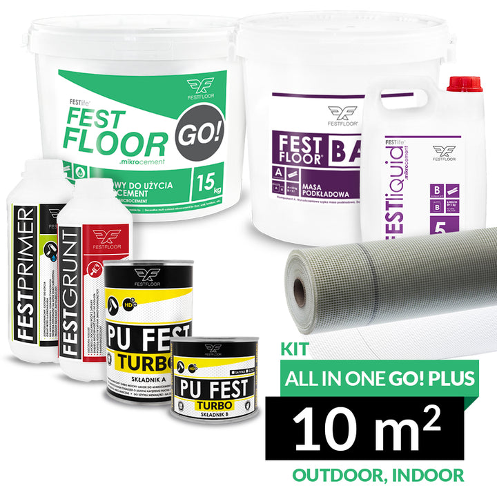 FESTFloor BAZA avec maille : 20 kg de béton ciré FESTFLOOR BAZA (15 kg de FESTPowder BAZA + 5 kg de FESTLiquid) + 10 m2 de maille en fibre de verre